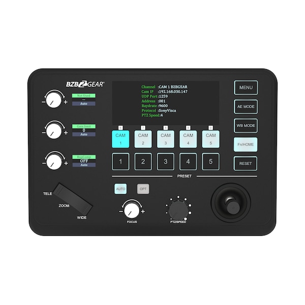 Introducing the BG-Commander-Jr, the compact yet powerful professional-grade joystick controller designed to meet the demands of a variety of applications. With its 2-axis joystick and zoom bridge key design, this controller provides refined control, durability, and stability, ensuring smooth and precise camera movement. The BG-Commander-Jr sets itself apart with its 7-level PTZ speed control, providing operators with complete control over their camera movements with a visual indicator to show the current speed level. Image parameters such as exposure and gain are easily adjustable with knob-style controls and their own small displays showing current value for easy reference. This versatile controller is designed for simultaneous communication and system compatibility, supporting integrated VISCA, UDP, and PELCO P/D control protocols in addition to RS232, RS422/RS485, and IPUDP interfaces. Operators can rest assured that the BG-Commander-Jr will seamlessly integrate with their existing ecosystem, providing easy and reliable control. Real-time preset set, call, and reset functionality is available on the main display screen, making it easy for operators to manage and access presets without interrupting their workflow. The responsive silicone buttons are backlit for a comfortable user experience in low light environments, making this controller ideal for a range of applications, including professional AV systems, broadcasting, education, telemedicine, video conferencing, houses of worship, and more. Compact yet powerful, the BG-Commander-Jr is the perfect choice for anyone looking for a professional-grade joystick controller that provides complete control, durability, and compatibility. BZBGEAR has a number of award winning products from past tradeshow events. These award winning products were nominated and judged against other nominees. See what makes our award winning products so extraordinary!