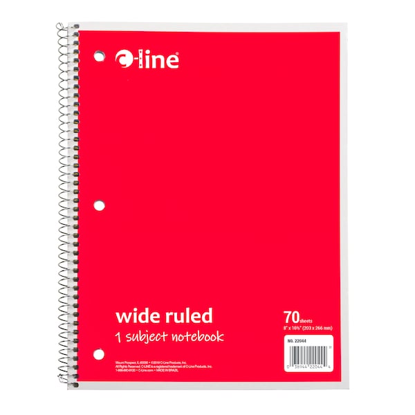 Instantly create writing space in binders and folders, by inserting the Spiral-Bound 1-Subject Notebook. Perfect for students and professionals, these notebooks feature a durable cover that helps protect the content written on the pages inside. Wide ruled format: the bright white paper has blue handwriting lines with a red margin divider to allow for neat writing. Solid colored front cover adds style to notebooks, while also making it easy to organize projects or classes by color. Attach this 3-hole punched spiral notebook into a standard 3-ring binder to create the ultimate organizational tool that keeps all your notes and hand-outs in one place. Perforated edges reduce paper waste by allowing pages to tear out neatly. 70-page spiral bound notebook. Colored front cover, gray board back cover. Red. This item includes 24 each of CLI22044 (One 1-Subject Notebook).