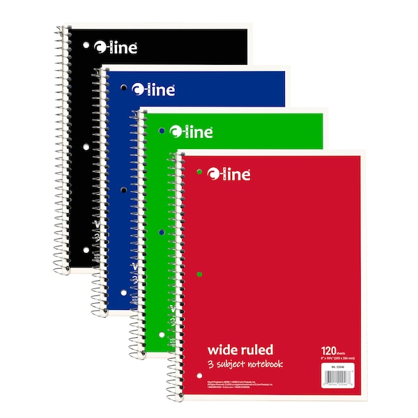 Instantly create writing space in binders and folders, by inserting the Spiral-Bound 3-Subject Notebook. Perfect for students and professionals, these notebooks feature a durable cover that helps protect the content written on the pages inside. Wide ruled format: the bright white paper has blue handwriting lines with a red margin divider to allow for neat writing. Solid colored front cover adds style to notebooks, while also making it easy to organize projects or classes by color. Attach this 3-hole punched spiral notebook into a standard 3-ring binder to create the ultimate organizational tool that keeps all your notes and hand-outs in one place. Perforated edges reduce paper waste by allowing pages to tear out neatly. 120-sheet spiral bound notebook with 2 dividers keeps subjects organized. Colored front cover, gray board back cover.