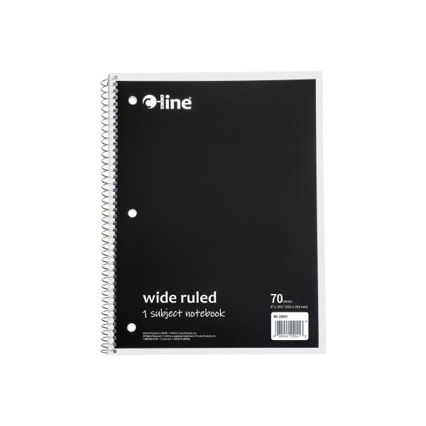 Instantly create writing space in binders and folders, by inserting the spiral-bound 1-subject notebook. Perfect for students and professionals, these notebooks feature a durable cover that helps protect the content written on the pages inside. Wide ruled format: the bright white paper has blue handwriting lines with a red margin divider to allow for neat writing. Solid colored front cover adds style to notebooks, while also making it easy to organize projects or classes by color. Attach this 3-hole punched spiral notebook into a standard 3-ring binder to create the ultimate organizational tool that keeps all your notes and hand-outs in one place. Perforated edges reduce paper waste by allowing pages to tear out neatly. 70-page spiral bound notebook. Colored front cover, gray board back cover. Black. This item includes 48 each of cli22041 one 1-subject notebook.