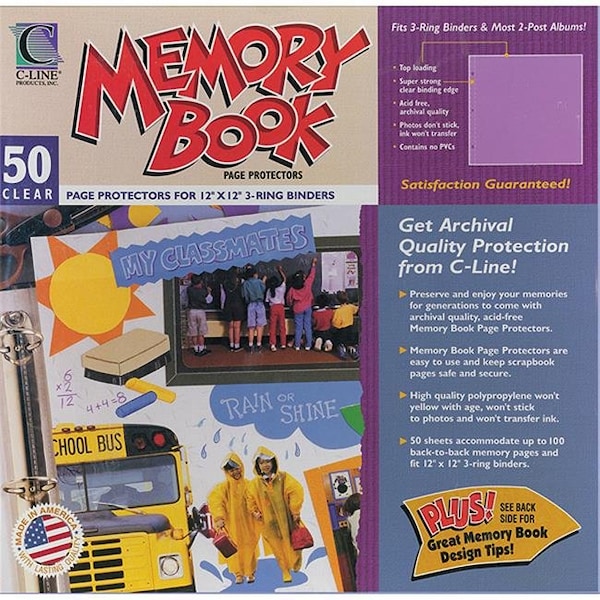 C-LINE PRODUCTS-Memory Book Top-Load Page Protectors. 12x12. 3-Ring and Postbound; 50 per box. Preserve and enjoy memories for generations to come with archival quality acid free page protectors. Extended binding edge allows pages to lay flat. PVC free polyproylene will not yellow transfer ink or stick to photos.