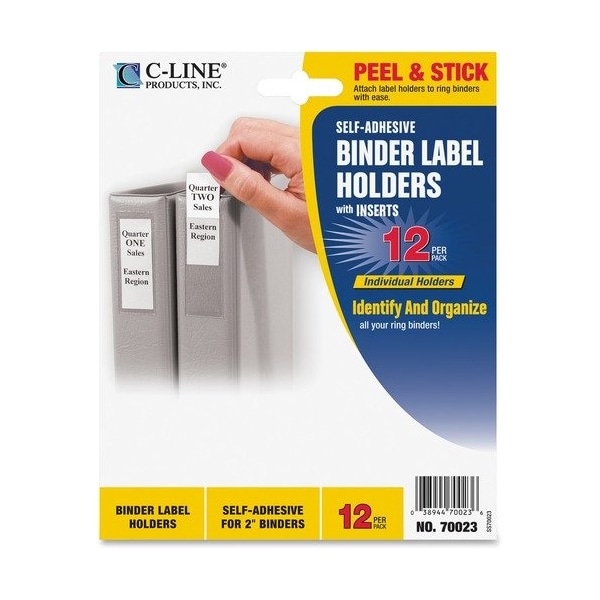 Make binders easy to identify when placed on the spine of the binder. Customize your own labeling system in seconds. Simply peel, stick and apply to any flat binder spine. Precut, blank inserts are included with the holders to make labeling easy. Holders are sized to perfection to fit on any standard binder. Download free templates at C-Line's website. Colors: Clear, Size: 2.25 x 3.06, Binder Capacity: 2'', Load Style: Top.