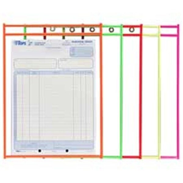Stitched Shop Ticket Holders are made of heavy-duty clear vinyl pockets with stitched, reinforced neon color edging. Design offers clear sides and metal eyelet at top for hanging. Insert size is 9" x 12". Color-coded edging is ideal for organizing work by department, day of week or importance.