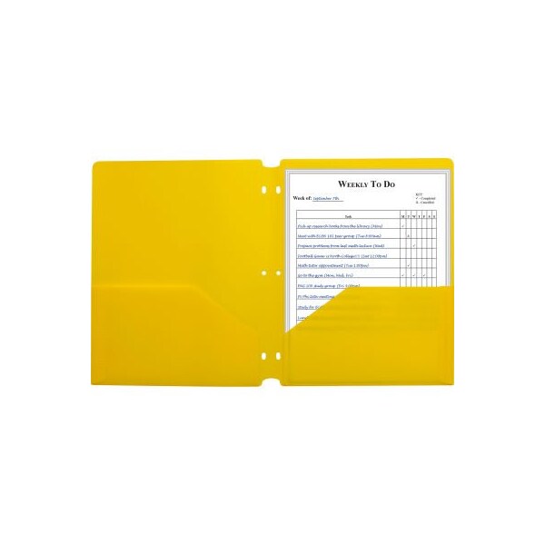 Need some help keeping your three-ring binder in order? with the help of these specialty two-pocket folders, letter-size papers can stay organized, while still remaining accessible. Two-pocket heavyweight polypropylene portfolios / folders with three-hole punch hold papers and resist tearing. Features three-hole punching for secure storage in standard 3-ring binders. Cut-outs at the top and bottom keep portfolio from being caught in binder open-close mechanism. Yellow. This item includes 25 each of cli33936 1 two-pocket heavyweight poly portfolio folder.