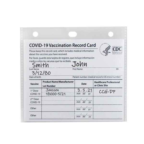 Protect your COVID19 Vaccine Document by storing it in a protective acidfree poly holder Unique 3hole punch design allows the holder to be paired with a lanyard, keeping the document visible while attending sporting events or during travel Top loading design makes it easy to remove the card to add additional information at a later date Poly material is vital to preserving the documents information since it eliminates photocopy transfer from occurring This means that the pen ink or label print will not transfer to the holder, which eliminates damage from occurring to the document itself Unlike vinyl material, poly will not crack or wrinkle when exposed to extreme heat or freezing temperatures Insert size on this clear holder is 4 x 3 50PK