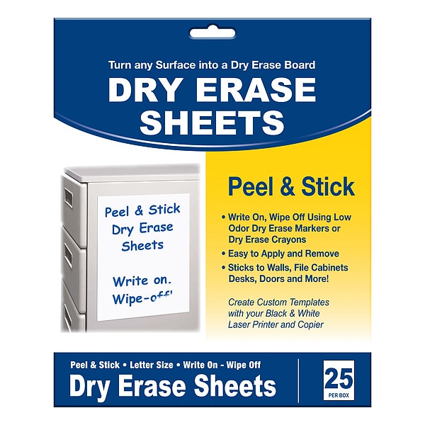 Dry Erase Product Grouping Dry Erase Sheet, Board Properties Non-Magnetic, Mounting/Mobility Type Self-Sticking, Dry Erase Surface Type Plastic, Dry Erase Height 11 in, Dry Erase Width 8 1/2 in, Dry Erase Surface Finish Gloss, Includes (25) Removable and Repositionable Sheets, Sheets Per Roll 25, White, Dry Erase Sheets, Package Quantity 25