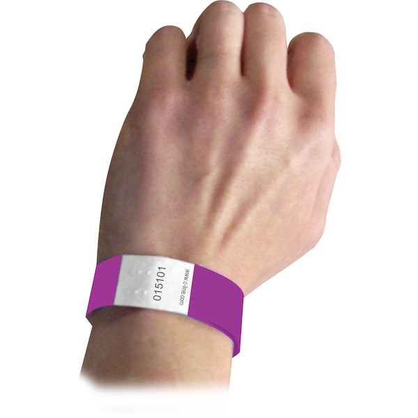 Security wristbands, made with DuPontTM Tyvek®, are an economical solution to visitor and crowd control. The single-use, waterproof wristbands are great for parties, events, field trips or tagging inventory and supplies. Bands are sequentially numbered (choice of starting number not available). To use, peel-off adhesive liner, wrap around wrist and adhere to other side of wristband. 3/4" wide x 10" long. Purple. Each pack includes 100 wristbands. Sold as 2 packs for a total of 200 wristbands.