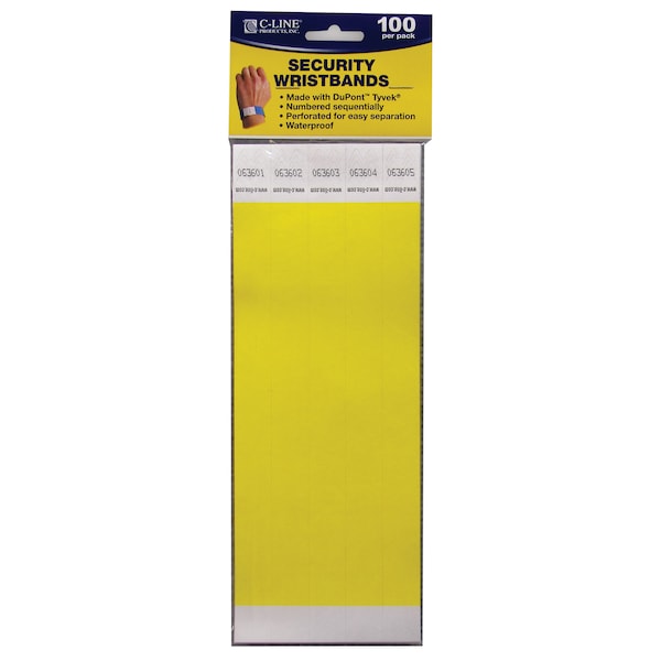 Security wristbands, made with DuPontTM Tyvek®, are an economical solution to visitor and crowd control. The single-use, waterproof wristbands are great for parties, events, field trips or tagging inventory and supplies. Bands are sequentially numbered (choice of starting number not available). To use, peel-off adhesive liner, wrap around wrist and adhere to other side of wristband. 3/4" wide x 10" long. Yellow. Each pack includes 100 wristbands. Sold as 2 packs for a total of 200 wristbands.