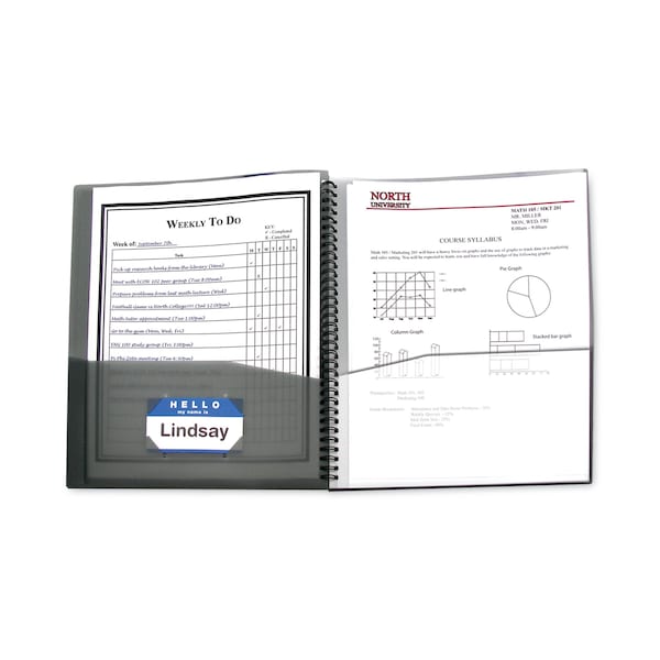 Organize projects, subjects, notes and more in one convenient place. Spiral-bound poly portfolio organizes all your materials while keeping them secure and protected during transport. Clear-view front pocket holds your custom cover sheet. For 8 1/2" x 11" document storage. Convenient business card slot.