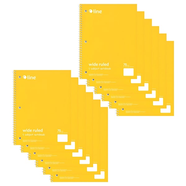 Instantly create writing space in binders and folders, by inserting the Spiral-Bound 1-Subject Notebook. Perfect for students and professionals, these notebooks feature a durable cover that helps protect the content written on the pages inside. Wide ruled format: the bright white paper has blue handwriting lines with a red margin divider to allow for neat writing. Solid colored front cover adds style to notebooks, while also making it easy to organize projects or classes by color. Attach this 3-hole punched spiral notebook into a standard 3-ring binder to create the ultimate organizational tool that keeps all your notes and hand-outs in one place. Perforated edges reduce paper waste by allowing pages to tear out neatly. 70-page spiral bound notebook. Colored front cover, gray board back cover. Yellow. Sold as a pack of 12.
