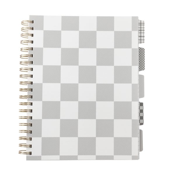 - The Project Book cover has a printed gray and white checkered design on the outside and smooth white finish on the inside