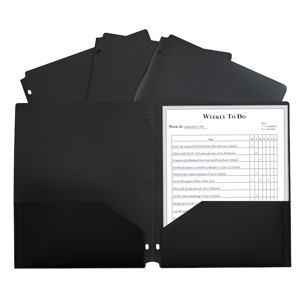 Need some help keeping your three-ring binder in order? With the help of these specialty two-pocket folders, letter-size papers can stay organized, while still remaining accessible. Two-pocket heavyweight polypropylene portfolios/folders with three-hole punch hold papers and resist tearing. Features three-hole punching for secure storage in standard 3-ring binders. Cut-outs at the top and bottom keep portfolio from being caught in binder open-close mechanism. Black. Sold as a pack of 12.