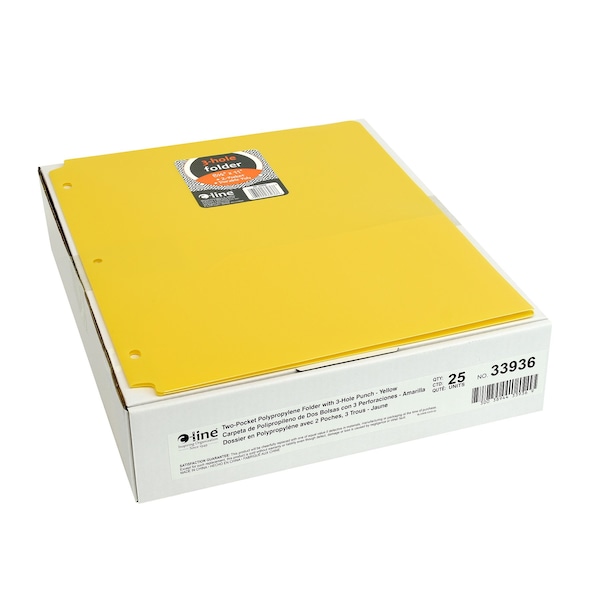 Need some help keeping your three-ring binder in order? With the help of these specialty two-pocket folders, letter-size papers can stay organized, while still remaining accessible. Two-pocket heavyweight polypropylene portfolios/folders with three-hole punch hold papers and resist tearing. Features three-hole punching for secure storage in standard 3-ring binders. Cut-outs at the top and bottom keep portfolio from being caught in binder open-close mechanism. Yellow. Sold as a pack of 25 folders.