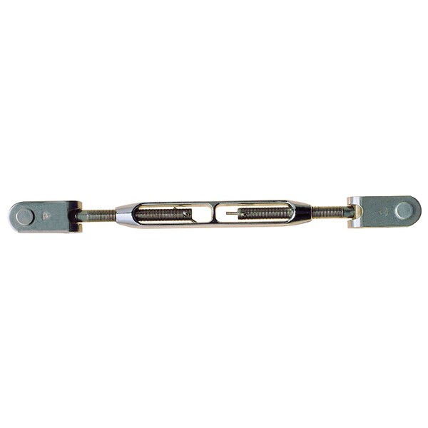 Jaw/Jaw Open Body Turnbuckle - 1/2-20 Thread For those who prefer a traditional body turnbuckle. The forged silicon bronze body, coupled with our integral toggle jaw, provides positive locking and ease of adjustment. Forged silicon bronze bodies with 316 stainless ends offer a great non-galling combination. Integral toggle jaw eliminates the need for a separate rigging toggle. Specifications : Machine swage Bronze body/ 316 stainless ends Wire size: 5/16" Breaking strength: 10,500 pounds Safe working load: 4,200 pounds Thread size: 1/2-20 Pin to pin length: 11-1/2" (closed) 15-1/2" (open) Body length: 6-1/2" Pin diameter: 1/2" Weight: 1 pound