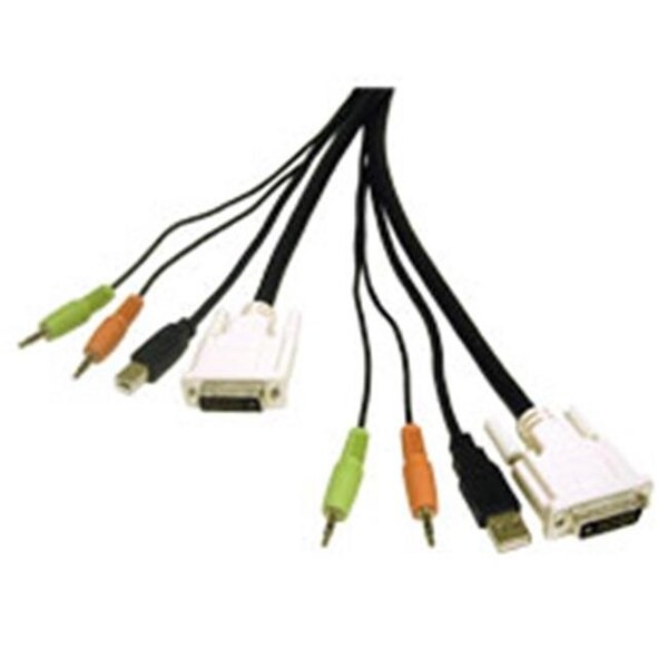 This precision-engineered all-in-one KVM cable is designed to connect your flat panel speakers and microphone to your USB/DVI KVM. The DVI-D segment delivers the high-performance high-bandwidth interface needed for video displays of today while leaving headroom for the products of tomorrow. The DVI-D dual link configuration provides enough bandwidth for resolutions up to 2048 x 1536 and allows high-speed digital transmission up to 9.9 Gbps. The connectors are color-coded to match the ports on your personal computer or notebook to ensure a simple connection. The black cable jacket disappears behind your desk to leave a clean organized look without the clutter and mess you ll have with ordinary individual extension cables. Constructed from UL-listed materials the USB2.0/DVI KVM Cable meets the rigid standards of everyday use. Input Connectors: DVI-D 24-pin Male and USB 2.0 A Male and 3.5mm Male x2. Output Connectors: DVI-D 24-pin Male and USB 2.0 B Male and 3.5mm x2. All-in-one bonded cable design organizes and simplifies cable runs. Dual link digital signaling allows for high-speed transmission up to 9.9Gbps. Shielded under-mold protects against unwanted EMI/RFI interference. Tri-shielding with dual Mylar(R) foil and braid shield reduces interference. Gold-plated contacts provide full conductivity with no data loss. Resolutions up to 2048 x 1536. PC-99 color-coded connectors for easy installation. DVI-D supports digital signal only.