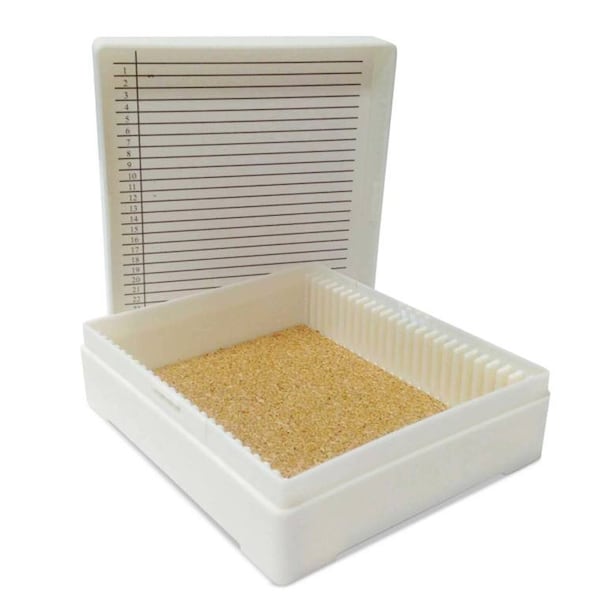 Details:Sturdy ABS plastic box with our exclusive selflocking lid holds up to 25 slides and has cork lined bottom.Index paper in lid corresponds withembossed numerals on bottom of box.