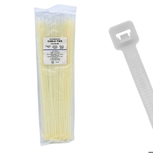 The 14" 40 lb Natural Intermediate Cable Tie offers versatile strength for everyday bundling needs. These intermediate zip ties strike the perfect balance between size and strength, making them suitable for a wide range of household, office, and light industrial applications. This product features an Intermediate duty tensile strength of 40 lb. It is 14 in long and 0.14 in wide. The maximum bundle diameter is 4.01 in. Made from Nylon 6/6, this natural color tie is designed for indoor cable management. It features a Self Locking Head. It operates in temperatures from -40 Degrees F to 185 Degrees F. This product is sold in a pack of 100. It meets the industry standards of quality being RoHS compliant and UL Rated.