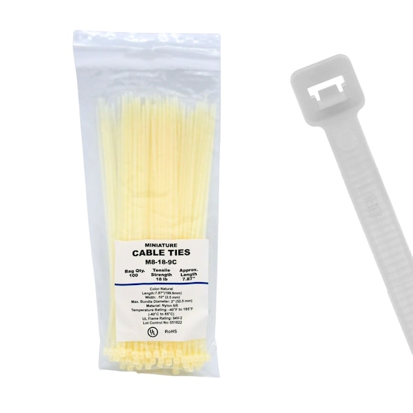 The 8" 18 lb Natural Miniature Cable Tie is ideal for small, tight spaces and lightweight bundling tasks. These miniature zip ties are perfect for intricate projects and securing small electronic components, offering a compact and discreet fastening solution. This product features a Miniature duty tensile strength of 18 lb. It is 8 in long and 0.1 in wide. The maximum bundle diameter is 2.2 in. Made from Nylon 6/6, this natural color tie is designed for indoor cable management. It features a Self Locking Head. It operates in temperatures from -40 Degrees F to 185 Degrees F. This product is sold in a pack of 100. It meets the industry standards of quality being RoHS compliant and UL Rated.