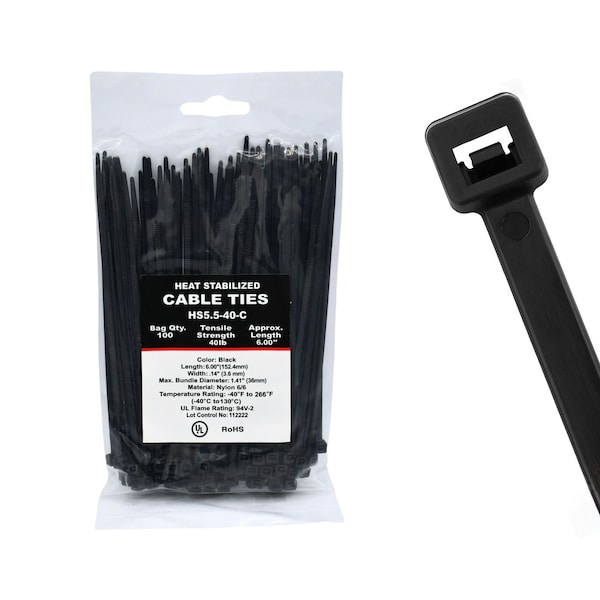 The 5.5" 40 lb Black Heat Stabilized Cable Tie is designed for reliable fastening in high-temperature environments. These heat-stabilized zip ties are specially formulated to resist degradation and maintain tensile strength in continuous operating temperatures up to 250 Degrees F, making them ideal for automotive, aerospace, and industrial machinery applications where standard ties would become brittle or fail. This product features an Intermediate duty tensile strength of 40 lb. It is 5.5 in long and 0.14 in wide. The maximum bundle diameter is 1.1 in. Made from Heat Stabilized Nylon 6/6, it is UV Resistant and rated for outdoor use. It features a Self Locking Head. It operates in temperatures from -40 Degrees F to 250 Degrees F. This product is sold in a pack of 100. It meets the industry standards of quality being RoHS compliant and UL Rated.