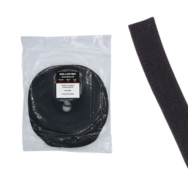 The 0.75 in Black Hook and Loop Continuous Roll provides adjustable cable management. This hook and loop fastening solution offers a reusable, adjustable, and gentle way to bundle cables without the risk of over-tightening or damaging sensitive wires. This product is 75 ft long and 0.75 in wide. It is made from Polypropylene and is cut to length. The closure type is Wrap. It is black and designed for indoor use. This product is sold as a single roll.