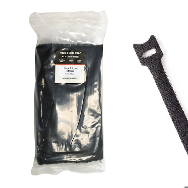Self-Gripping Cable Tie, 12 in L, 0.75 in W, Hook and Loop Closure, Black, 100PK