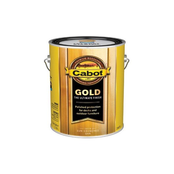 Cabot Gold Gallon Drenched Oak Ultimate Wood Finish Low VOC 275 G/L Providing Beautiful Sheen & Strong Protection From Mother Natures Worst UV Sun Damage Extreme Temperatures Rain & Moisture First Coat Penetrates Second Coat Adds Dimension As It Seals Finish Mimics The Look Of Interior Hardwood Floors Amount Of Sheen Will Vary Based On Number & Thickness Of Each Coat Will Weather Gradually Over Time Use On Exterior Wood Decks Siding Fences & Outdoor Furniture Provided Wood Is Sound & Free Of Other Coatings Sealers Dirt & Other Contaminants First Coat Covers 250-350 SQFT Per Gallon Second Coat Covers 300-400 SQFT Per Gallon Low VOC Replacement For Select Restricted Areas.