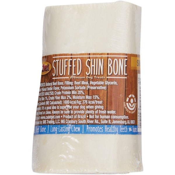 Treat your dog to the meat flavors they crave with this stuffed shin bone. This premium-quality dog chew bone is a real beef bone stuffed with soft and savory filling for the ultimate chewing satisfaction. Perfect for strong chewers this long lasting dog chew does not chip or break apart easily. From easing stress to providing an entertaining chewing challenge this durable dog bone is sure to keep your best friend busy while cleaning teeth and gums through mechanical chewing. Plus this shin bone for dogs can be stuffed again with your best friends favorite spreadable treats.