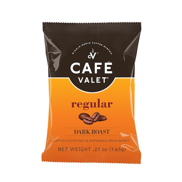 Café Valet Regular Dark Roast is a gourmet blend of Rainforest Alliance Certified and 100% Arabica coffee. The rich dark roast delivers great taste to the discerning coffee drinker. Café Valet single-serve coffee is served to over 100 million people a year by the Café Valet Single-Serve Coffee System. All Café Valet coffees are used exclusively with the Café Valet Single-Serve Coffee System and come in a patented filter pack with disposable brew basket.