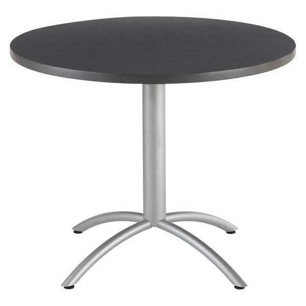 Cafe/Breakroom Table, Surface Material Laminated Melamine, Round, Diameter 42 in, Length 42 In., Height 30 in, Tabletop Color Family Gray, Tabletop Color Graphite Granite, Frame Color Silver, Assembled/Unassembled Unassembled, Frame Material Steel, Edge Color Gray, Edge Type T-Molded, Leg Type Arched, Top Thickness 1 1/8 in, Series CafeWorks, Load Rating 250 lb, Standards ANSI, BIFMA, Includes Swivel Base Levelers