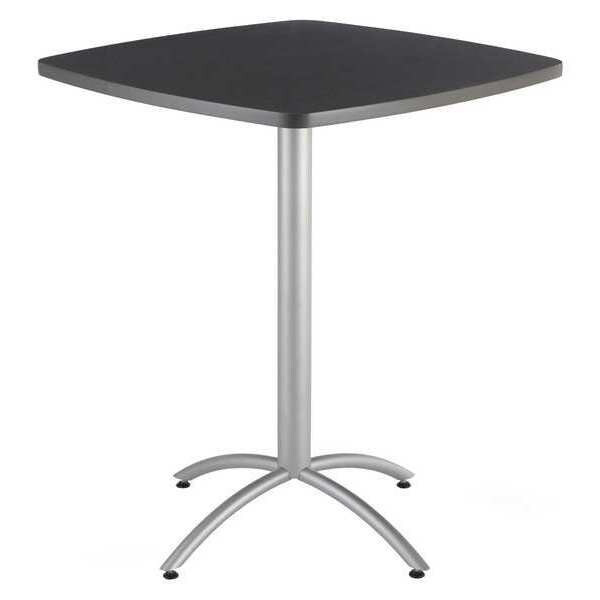 Cafe/Breakroom Table, Surface Material Laminated Melamine, Square, Width 42 in, Length 42 In., Height 42 in, Tabletop Color Family Gray, Tabletop Color Graphite, Frame Color Silver, Assembled/Unassembled Unassembled, Frame Material Steel, Edge Color Gray, Edge Type T-Molded, Leg Type Arched, Top Thickness 1 1/8 in, Series CafeWorks, Load Rating 250 lb, Standards ANSI, BIFMA, Includes Swivel Base Levelers