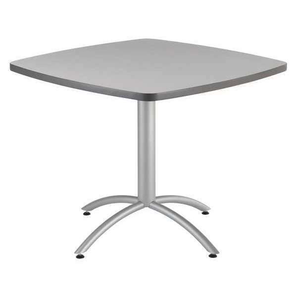 Cafe/Breakroom Table, Surface Material Laminated Melamine, Square, Width 42 in, Length 42 In., Height 30 in, Tabletop Color Family Gray, Tabletop Color Gray, Frame Color Silver, Assembled/Unassembled Unassembled, Frame Material Steel, Edge Color Gray, Edge Type T-Molded, Leg Type Arched, Top Thickness 1 1/8 in, Series CafeWorks, Load Rating 250 lb, Standards ANSI, BIFMA, Includes (4) Leveling Glides