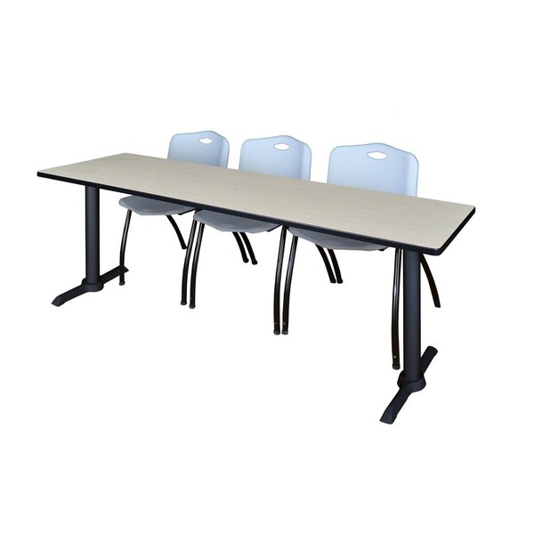 Whether you're planning a lounge, cafe, library, breakroom or restaurant, let the Cain Collection take you there. These versatile tables are at home in stylish cafe or coffee shop settings as well as training rooms. This set includes a 84-inch Cain training table and 3 Grey "M" Stack Chairs. The table is constructed of a thermal fused melamine laminate tabletop that is 1-inch thick and finished with a black T-Mold edge band. This Maple tabletop is double-sided and finished in Cherry on the other side. Simply pick the side you like and install the base on the other. Self tapping wood screws and a placement template are included. Laminates are scratch, stain and scald resistant and wipe clean easily. Rounded corners make the table safer for everyone. The stylish T-Base legs are constructed of tubular steel posts and solid steel T-Bases. Hidden adjustable glides on the bottom of the base keep the legs and tabletop level and are easy to adjust. The sturdy, lightweight "M" stack chair by Regency offers durability, style and value. Its black metal frame and contoured plastic seat and back are strong and easy to clean. This versatile stack chair easily stores away in stacks of 12 and features a built in handle for easy mobility. All Regency chairs are backed by a 5-year limited manufacturer's warranty on chair bases and frames and a 2-year limited manufacturer's warranty on chair mechanisms and upholstery. Cain tables are backed by a 10-Year Limited Manufacturer's Warranty.