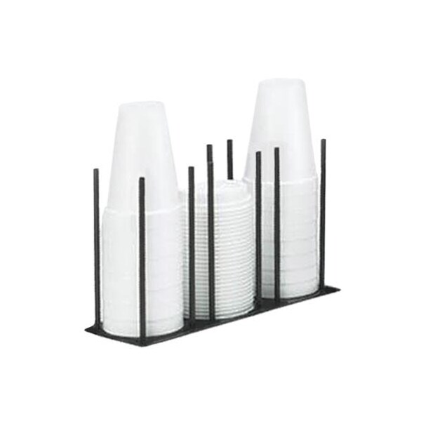 Eco Smart horizontal lid/ramekin organizer; 8 1/4 (W) x 3 in (Depth) x 6 in (H); 3 sections that hold lids, cups or ramekins up to 2 1/2 in (Diameter); Black iron solid base with wire partitions