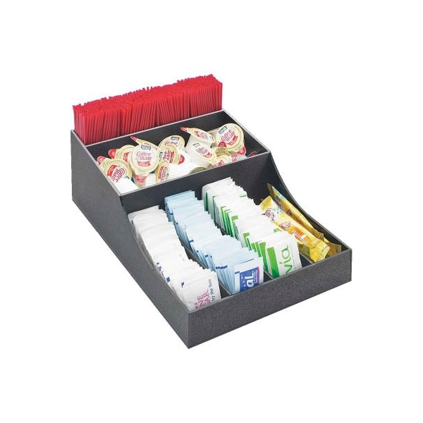 This condiment organizer is a great way to display and hold packets, stir sticks, and creamers. It features a black body that will complement any food service area. Dividers separate this unit into 9 individual compartments of varying sizes to accommodate all of your condiment needs. A wide middle compartment is perfect for napkins, while 8 smaller spots separate sugar, creamers and more!! it is perfect addition to any coffee station, while it offers organization and a bold look to impress your guests .