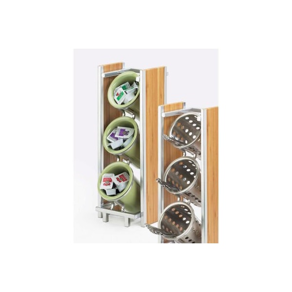 This cylinder display is perfect for any party, buffet, or catering event. It elevates and creates space to any table while adding a new and modern look to any event. Featuring a green alternative, this eco modern style has a bamboo body accented by a silver steel frame for a touch of bold and modern style. Cylinders sold separately, are offered in a variety of colors and materials for your choice of displaying flatware or condiments.