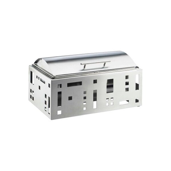 This squared chafer adds a bold and new look to any party, buffet, or foodservice event. Featuring a stainless steel roll top cover, this chafer will keep your warm foods fresh and ready until serving time. Product features: holds 4-5 cans of fuel for maintaining heat to keep food warm. Built in wind-guards, top included, but removable. Easy disassembly for cleaning and transportation. Dimensions: 23w x 15d x 9-1/4h.