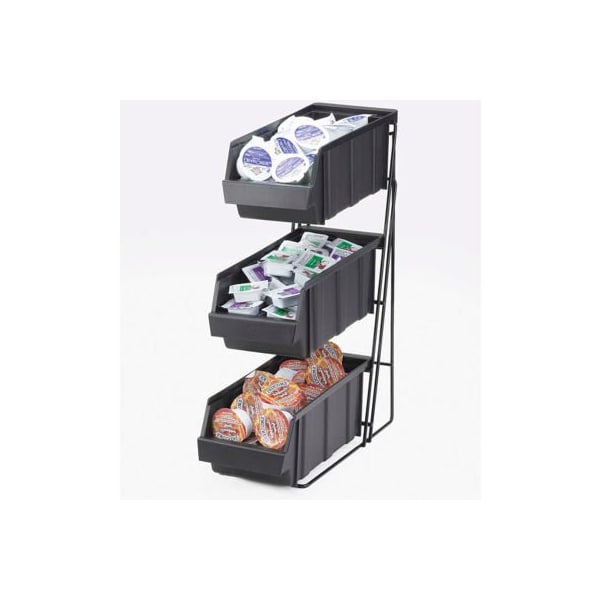 Save space with this condiment display that features a black wire frame and 3 removable black bins that can store condiments, creamers, packets, etc.