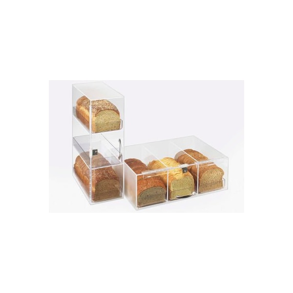 This classic 3 tier bread case can be styled in three different ways. If you are looking for something more simple and fresh, the case comes in all clear acrylic with no base. For a unique and modern twist, add on a black base or wood accent. Any of these bread cases will complement your bakery, cafe, or food service area.
