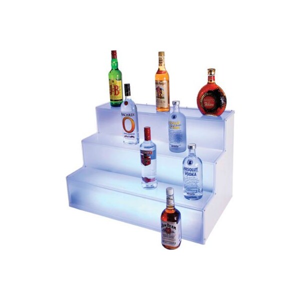 Brighten up your bar with our 3 level led liquor staircase. A great product for portable bar set-ups or to light up & bring alive the back bar area in the ballroom or meeting rooms. Select one solid color or choose continuously changing colors through slow fades with an easy, touch button control. Product features: frosted panel softly filters led light to create a one of a kind liquor or wine display . Lightweight for easy handling & transport but strong structure for durability. Dimensions: 18w x 30d x 18h.