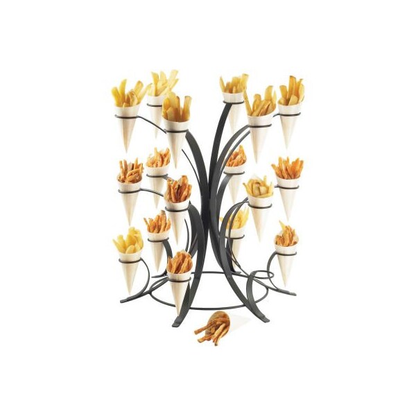 This beautiful display can be featured in a variety of situations. Use the durable metal frame as a center piece to display your appetizers in wooden cones, or have several spread out among your presentation to employ a central theme. Circular wire base ensures balance throughout the entire riser.