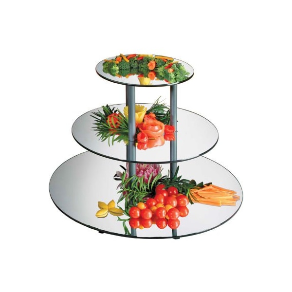 Round acrylic mirror triple tier elevates food with elegance and saves table top space. Easily reversible mirror/black sides create nice reflections and contrast to enhance food displays. Product features: food safe, protective hard-coated surfaces are scratch resistant. Pvc sleeved nylon rods offer sturdy support. Great centerpiece.