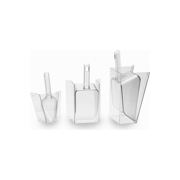 These scoop holders are constructed of durable polycarbonate and have no lid for easy access. These wall mounted scoop holders are a great way to stay organized and clean, keeping your scoop and it's holder off any table tops and out of the ice. Find the perfect style and size for your ice station and you will not be disappointed. Product features: includes scoop, hardware not included, durable polycarbonate, use with ingredients or ice, health department approved, keeps your scoop out of ice and water.