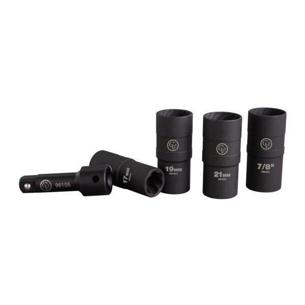 The 5 piece lug and lock flip socket set is designed to easily remove damaged lug nuts, using the 6 fluted twist socket end. Flip socket to other end to remove wheel locks with its 12 fluted twist design. A 1/2in Dr. 3in extension bar is recommended to use during operation. Sockets designed with 6 fluted twists for damaged lug nuts. Flip Socket opposite end has 12 fluted twists for wheel locks. All flip sockets have a 1/2in Dr. design. 1/2in Dr. 3in extension bar included. Heavy Duty blow molded case for storage.