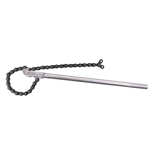 This versatile tool combines a heavy-duty 24in chain to grip nearly any shape round, square, or otherwise and a knurled, chrome-plated 20in handle to provide leverage to loosen almost anything, even in tight working spaces. Use to grip nearly any round or multifaceted object 3in to 6.75in in diameters, such as pipe, conduit, or other various items. Robust, 20-inch chrome-plated and knurled handle provides enough leverage for even the most stubborn items. Quickly adjusts for another turn without removing the tool or resetting the chain. Easy to reverse direction, loosen the chain, flip the handle, and seat the chain.