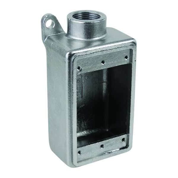 Electrical Box, Box Type FD, Number of Gangs 1, Bracket Type Bracket Not Included, Capacity 25 cu in, Material Stainless Steel, Number of 1/2 In. Back Knockouts 0, Number of 1/2 In. Side Knockouts 0, Clamp Type Clamp Not Included, Number of 1 In. Side Knockouts 0, Number of 3/4 In. Back Knockouts 0, Number of 3/4 In. Side Knockouts 1, Top Hub Location, Number of Hubs 1, Color Gray, Standards ANSI/NFPA 70, CAN/CSA-C22.1, CSA C22.2 No. 18.1-04, UL File # E307133, UL/cUL 514A Listed