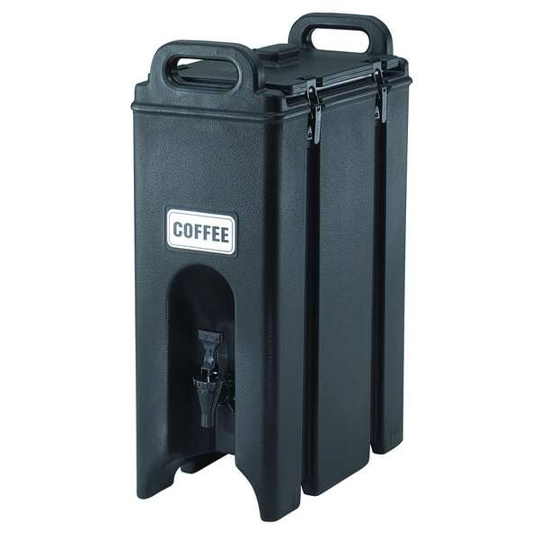 Beverage Dispenser, Capacity 4.8 gal, Shape Rectangle, Color Black, Overall Height 24 1/4 in, Overall Width 9 in, Overall Depth 16 1/2 in, Number of Dispensers 1, Material Polyethylene, Dispenser Actuation Faucet, Includes Blank Label, Coffee Label, Decaffeinated Coffee Label, Handle, Hot Water Label, Ice Tea Label, Lid, Lid Latches, Punch Label, Includes Label Yes, Insulated Yes, Standards NSF, Temperature Cold, Hot