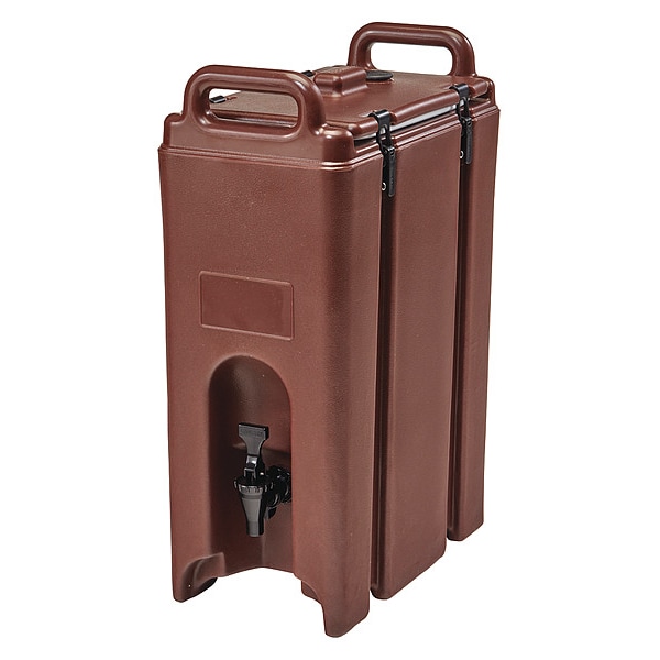 Beverage Dispenser, Capacity 4.8 gal, Shape Rectangle, Color Brown, Overall Height 24 1/4 in, Overall Width 9 in, Overall Depth 16 1/2 in, Number of Dispensers 1, Material Polyethylene, Dispenser Actuation Faucet, Includes Blank Label, Coffee Label, Decaffeinated Coffee Label, Handle, Hot Water Label, Ice Tea Label, Lid, Lid Latches, Punch Label, Includes Label Yes, Insulated Yes, Standards NSF, Temperature Cold, Hot