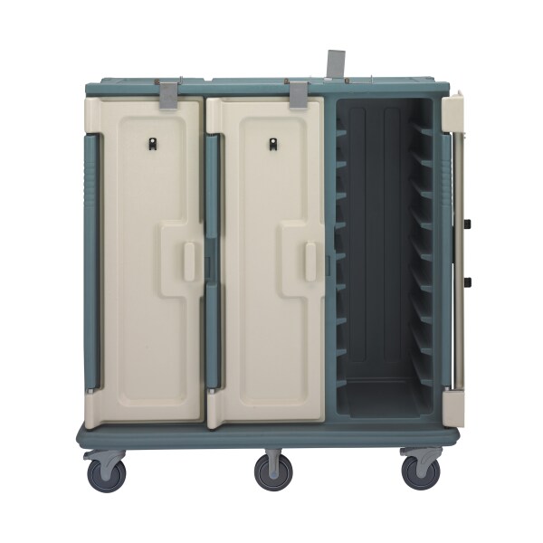 Meal Delivery Cart, Overall Depth 60 in, Caster Diameter 6 in, Caster Material Nylon, Inside Depth 53 3/8 cm, Inside Height 127 cm, Inside Width 39 cm, Overall Height 63 5/8 in, Product Type Meal Delivery Cart, Color Slate Blue, Distance Between Rails 5 in, Insulated Yes, Material Polyethylene, Number of Compartments 3, Number of Doors 3, Number of Trays 30, Overall Width 29 1/4 in, Number of Menu Clips 5, NSF Certified Yes, Caster Configuration (2) Rigid, (4) Swivel with Brakes