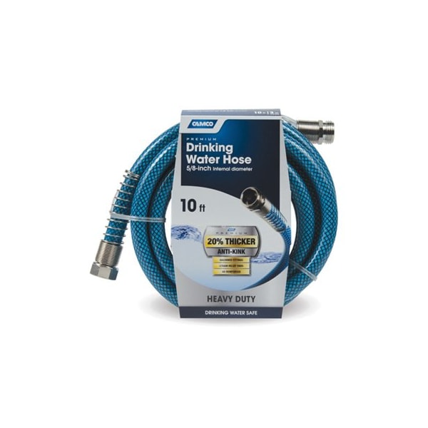 Camco, 10' Long, 58 ID, Tastepure Premium Drinking Hose, Drinking Water Safe, Made Of NSF Certified Hose, Won't Impart A Strong Plastic Taste To The Water, Heavy Duty Hose, 20 Percent Thicker Than Standard Hoses Features An Anti Kink Design, Measures, Made Of PVC, Hose Is Lead, BPA Phthalate Free, Quality Construction, Features Nickel Plated Machined Fittings For Added Durability, Compliant With All Federal State Level Low Lead Laws, CSA Low Lead Content Certified To NSF ANSI 372