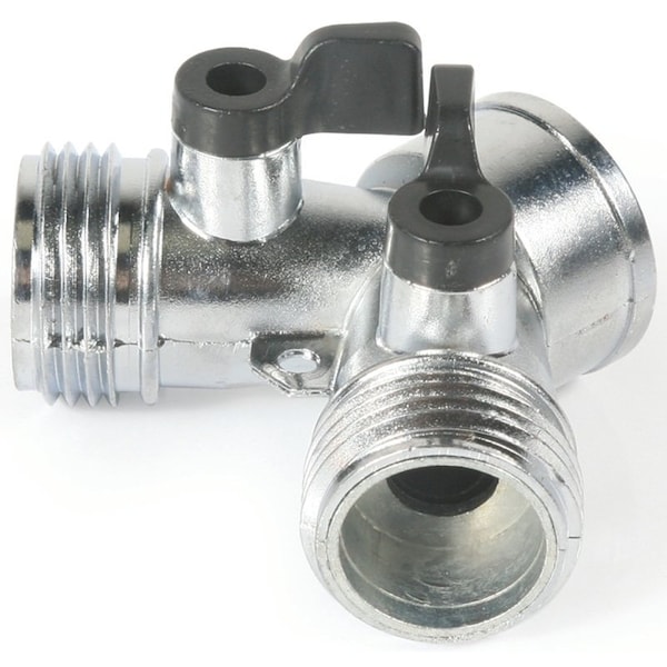 Control water flow with a quarter turn pressure seated valve. Y-style converts a single-line hose to two directions. Each side is valve controlled to easily adjust flow and pressure. Made of resilient plastic.